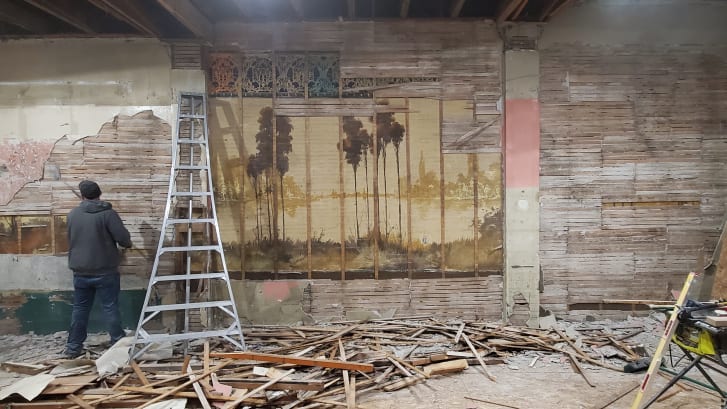 After the findings and examination of the murals, Lisa and Nick decided that it would be best that they be taken down, fixed and then re hung. Because of its large scale and the immense water damage, fixing the murals will be pricey but they have started a GoFundMe to help with some of the restoration of it. Once the murals are all fixed, they will become the focal point of their bar.